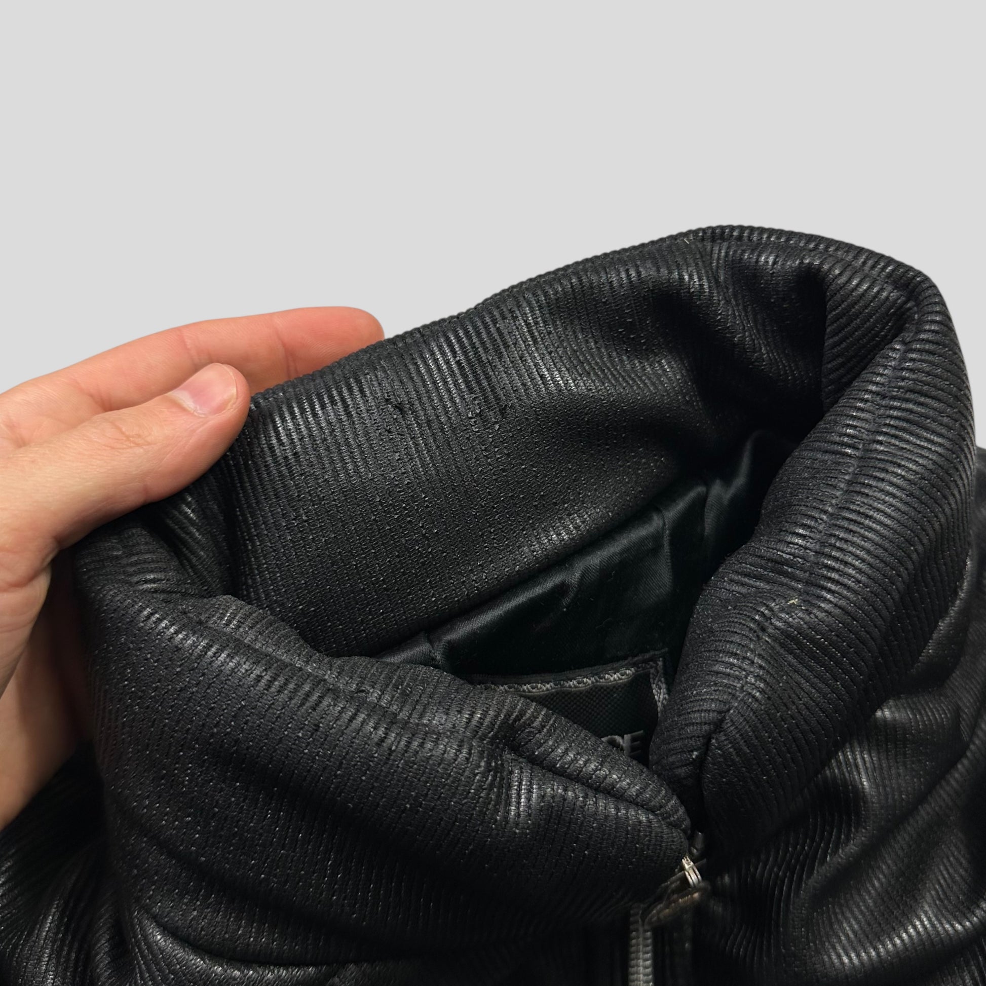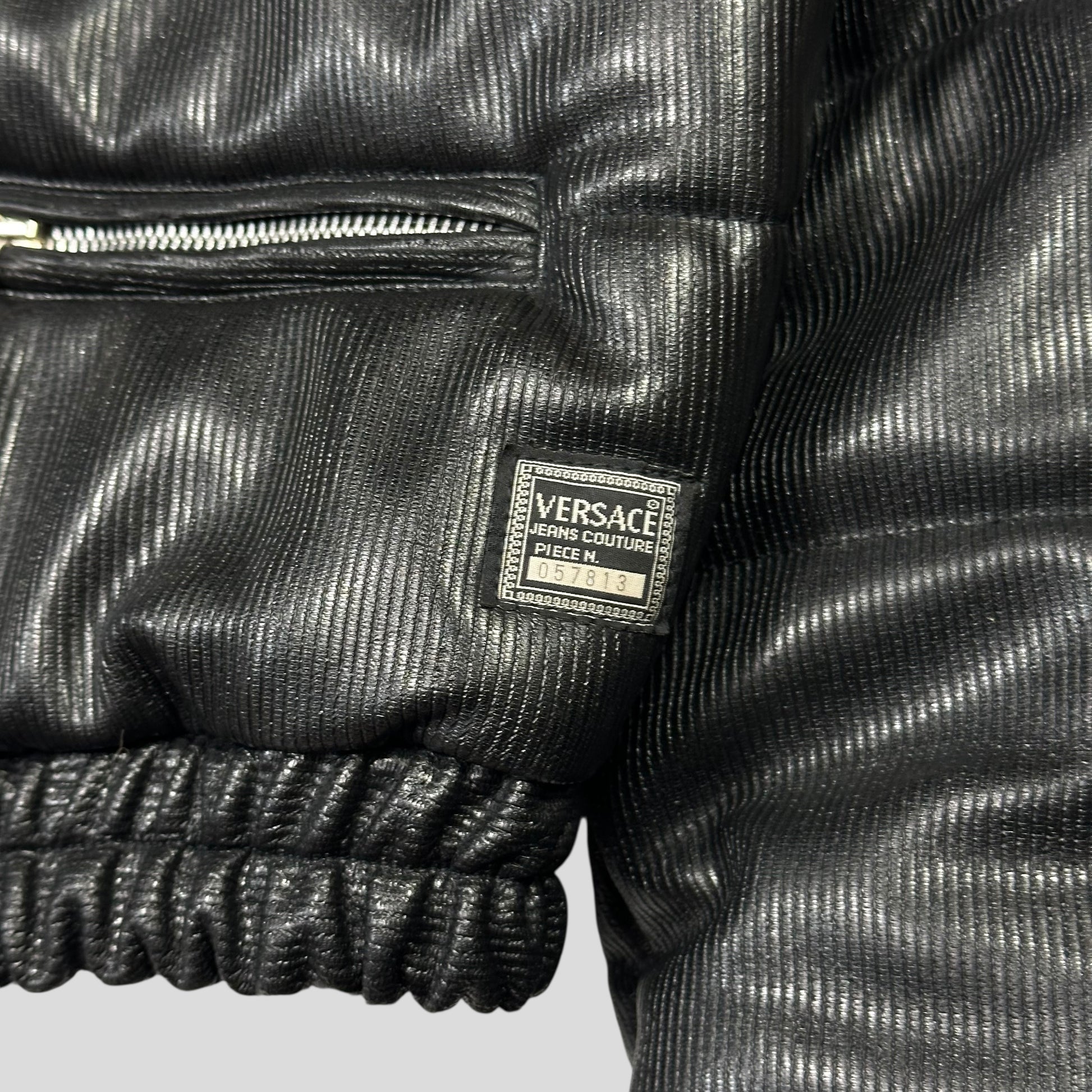 Very rare Womens Versace Jeans Couture 1990’s Down Filled Cropped Puffer Bomber Jacket, incredible ribbed polyester & polyurethane blend material that shimmers and glitters in natural light, Versace Medusa metal branded hardwear zips and logo to outside, silky soft lining, warm down fill.
