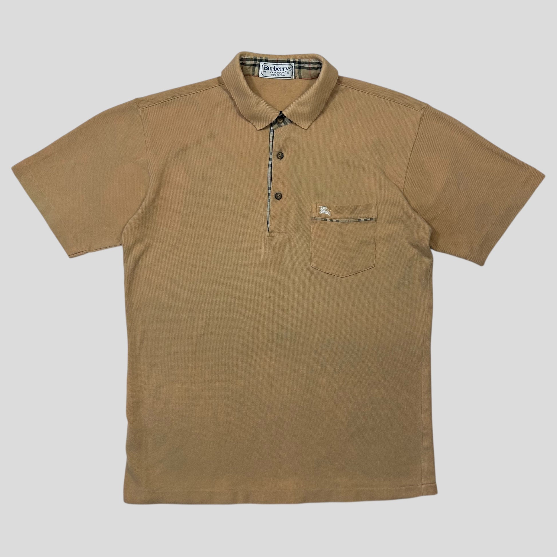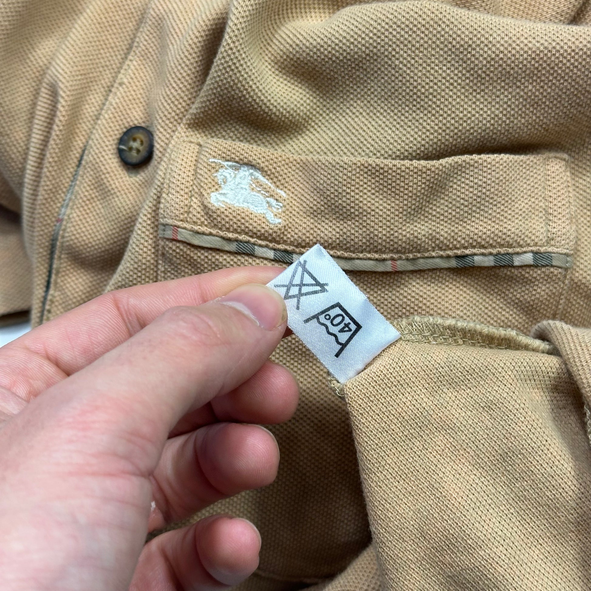 Rare tan sandy Burberrys London 1990’s polo shirt, nova check plaid detailing to pocket and collar, embroidered Prorsum Horse logo to chest.