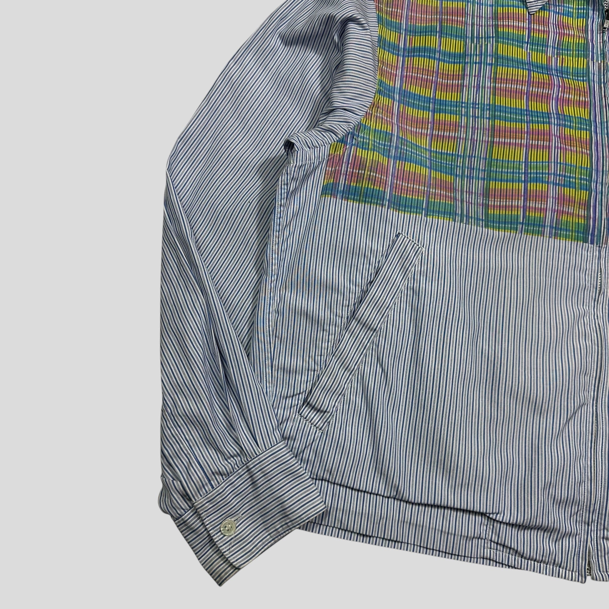 Very rare CDG SHIRT 1990’s striped lightweight cotton work jacket with this beautiful rainbow plaid transfer print to the chest, hand pockets at front and adjustable button back to cinch the fit, YKK metal zip up collar.