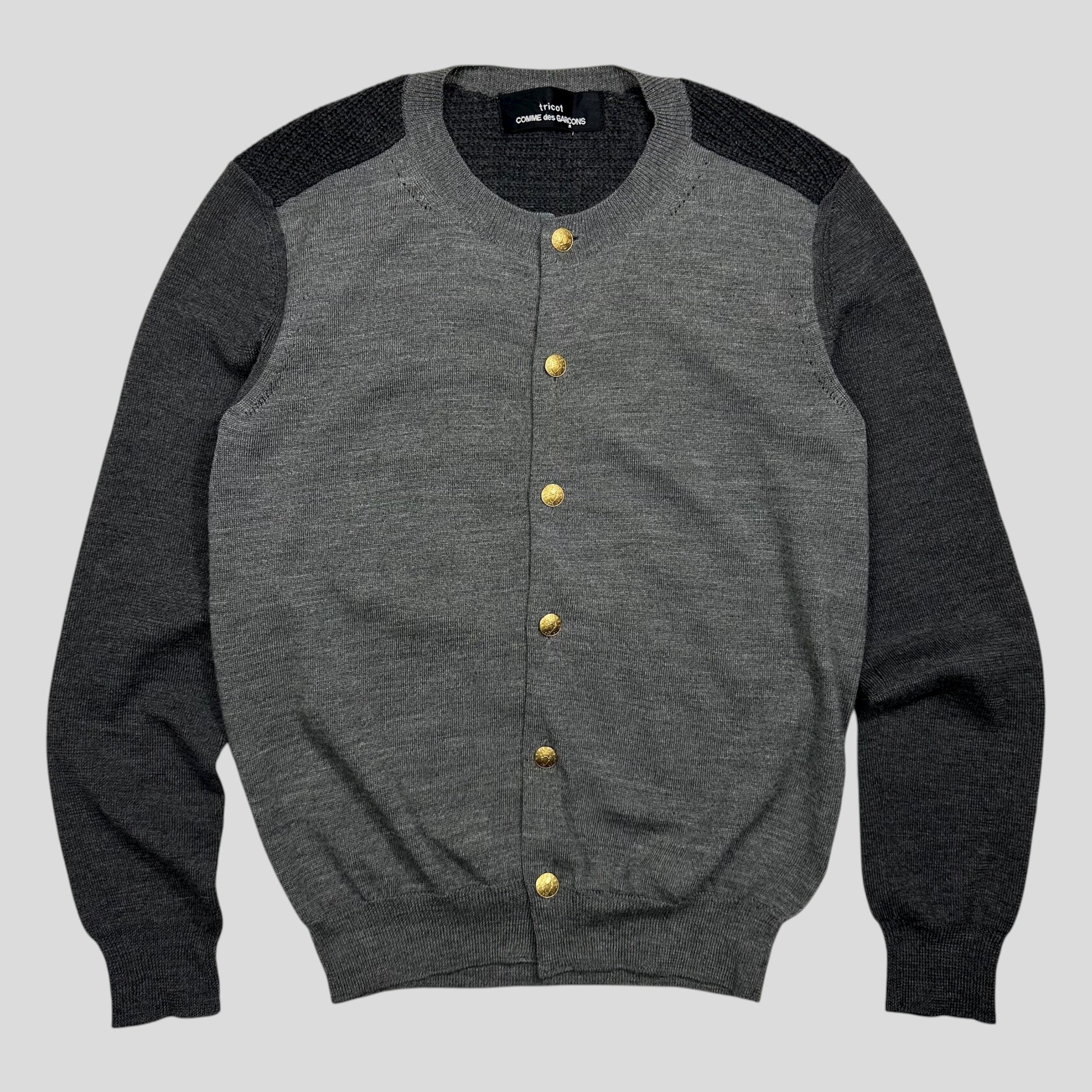 Rare 2011 CDG Tricot grey panelled cardigan, cool textured material to shoulders, tri-tonal grey, golden buttons.