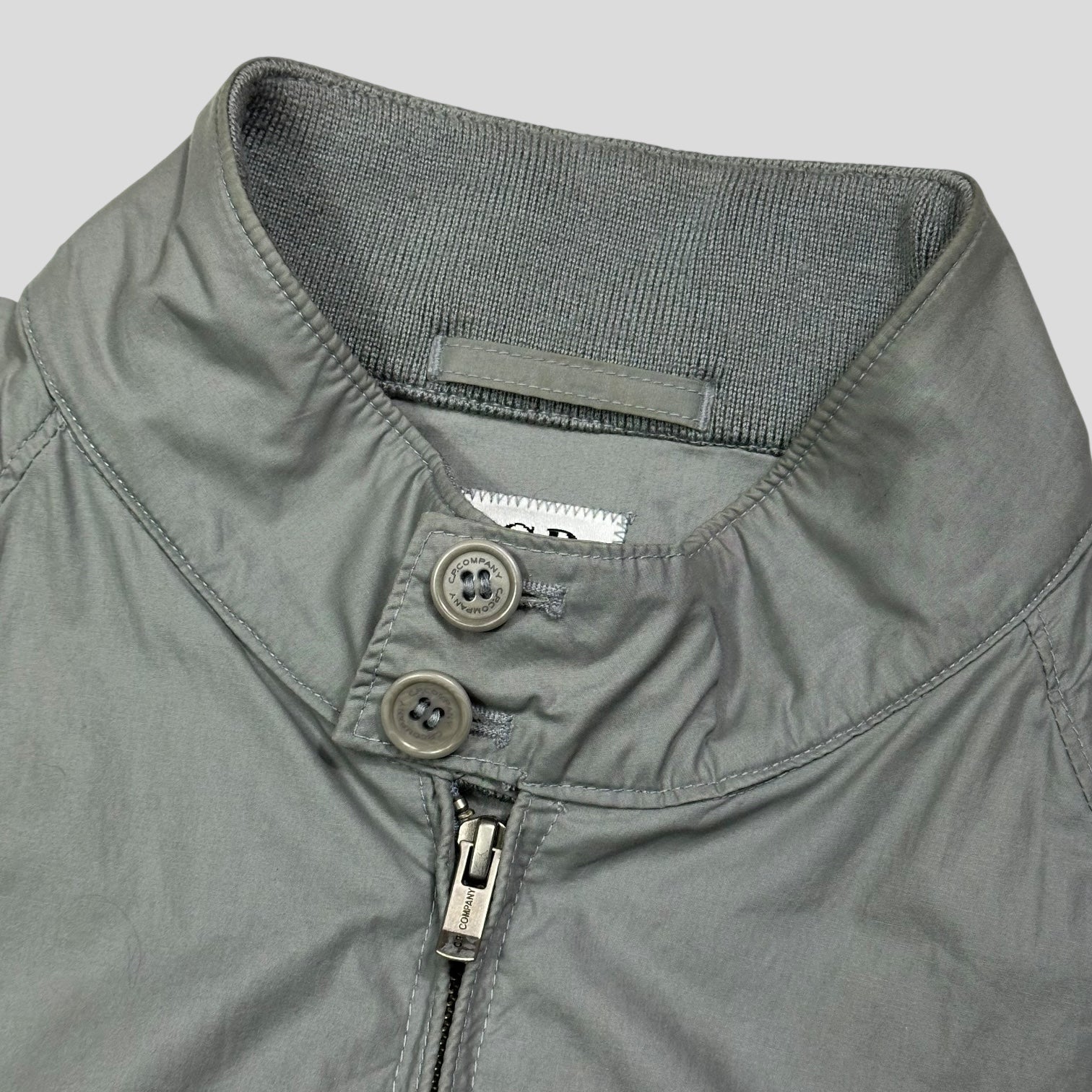CP Company spring summer 2009 lightweight grey cotton bomber jacket, branded button hand pockets to front, metal engraved YKK zipper, buttoned collar.