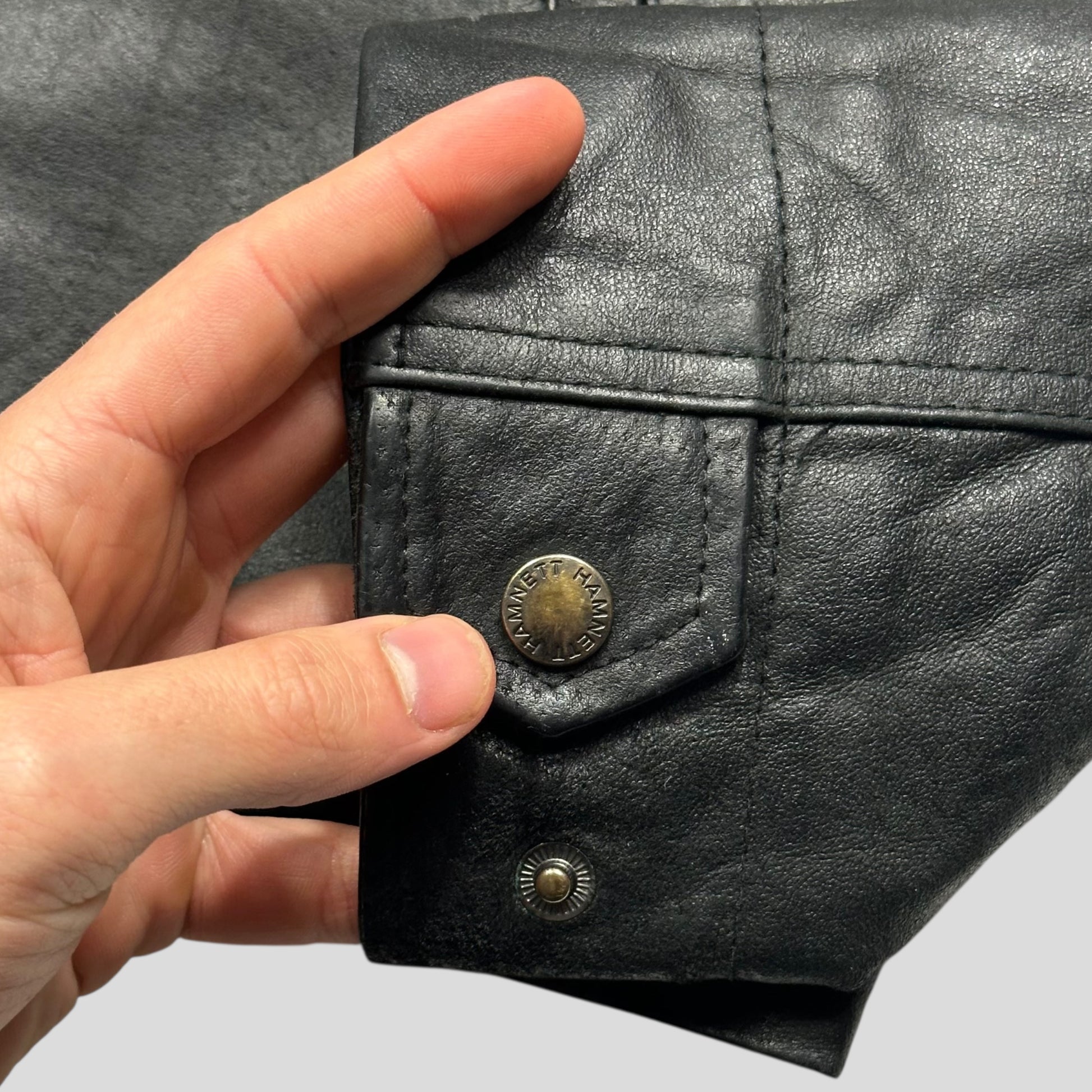 Rare 2000’s black real leather Kathrine Hamnet biker jacket, blue contrast nylon packable hood and quilted warm lining, quilted detailing to leather shoulders, pop button chest pockets and zip hand pockets.
