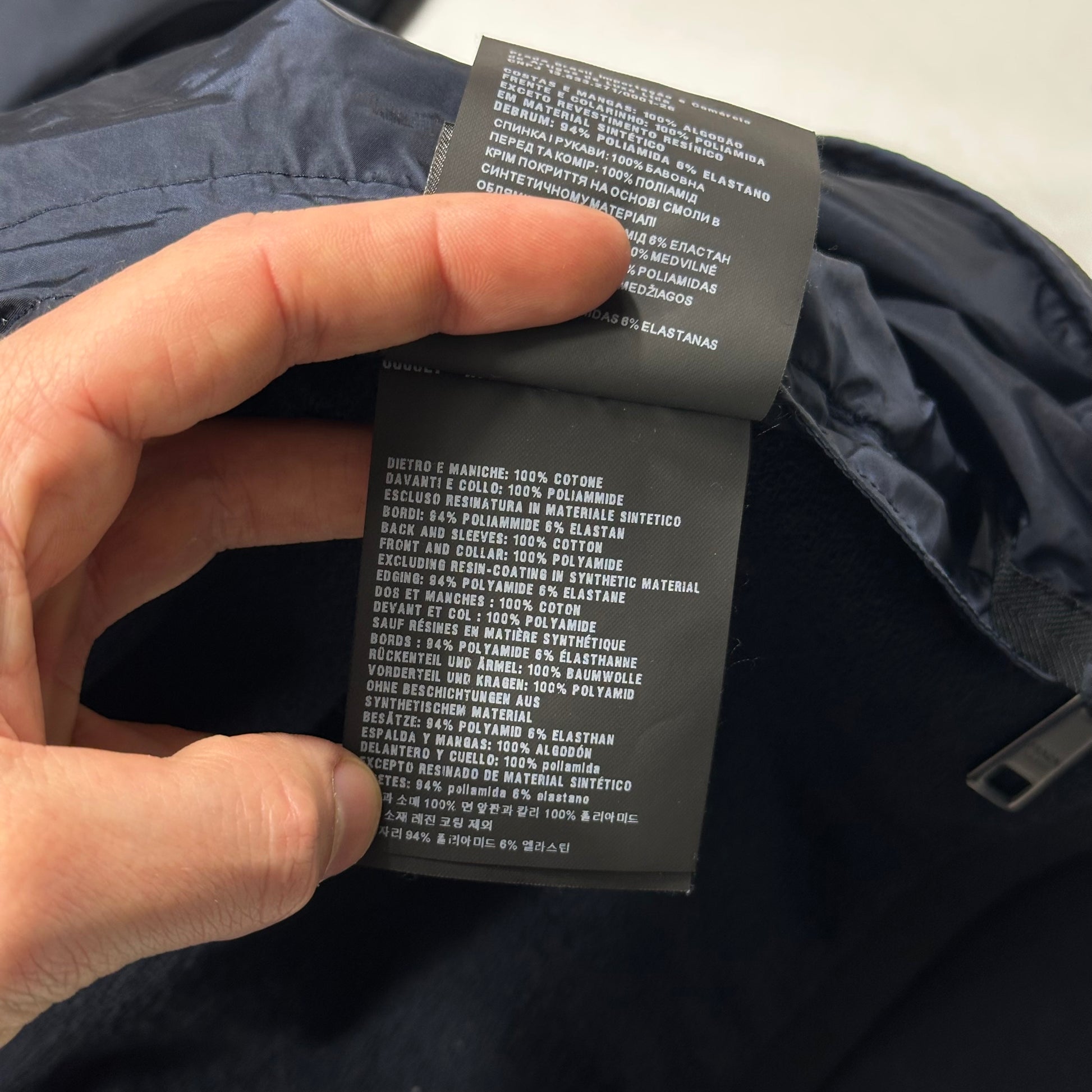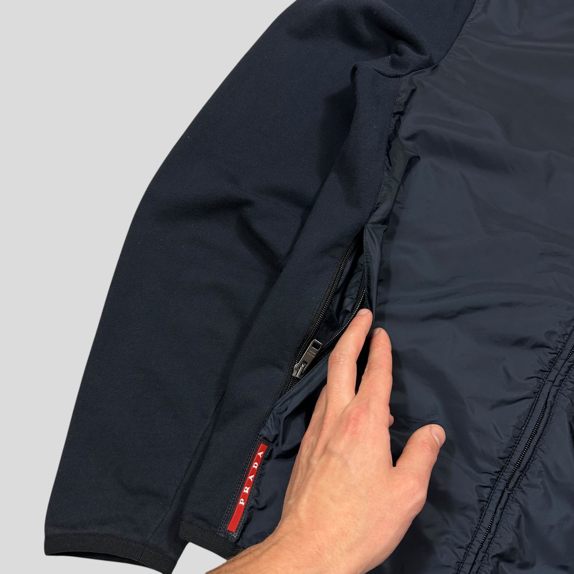 Prada Milano Mainline 2016 Red Tab Linea Rossa zip up nylon panelled cotton hoodie jacket, nylon is a lovely dark blue resin coated material that catches the sun, cotton panels are a dark navy, zip hand pockets to front.