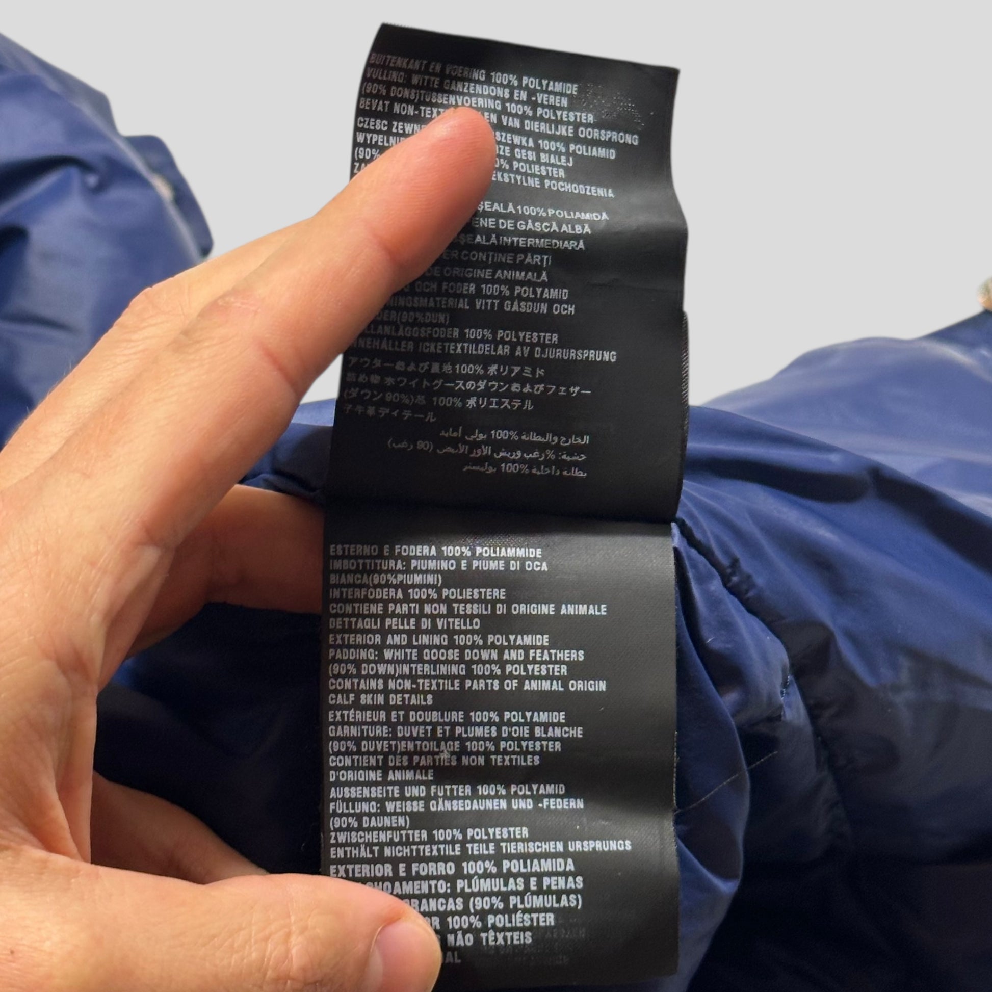 Prada mainline blue nylon puffer with thick but lightweight goose down fill, triangle plaque logo to arm, zip hand pockets and inside popper pocket, warm yet lightweight.