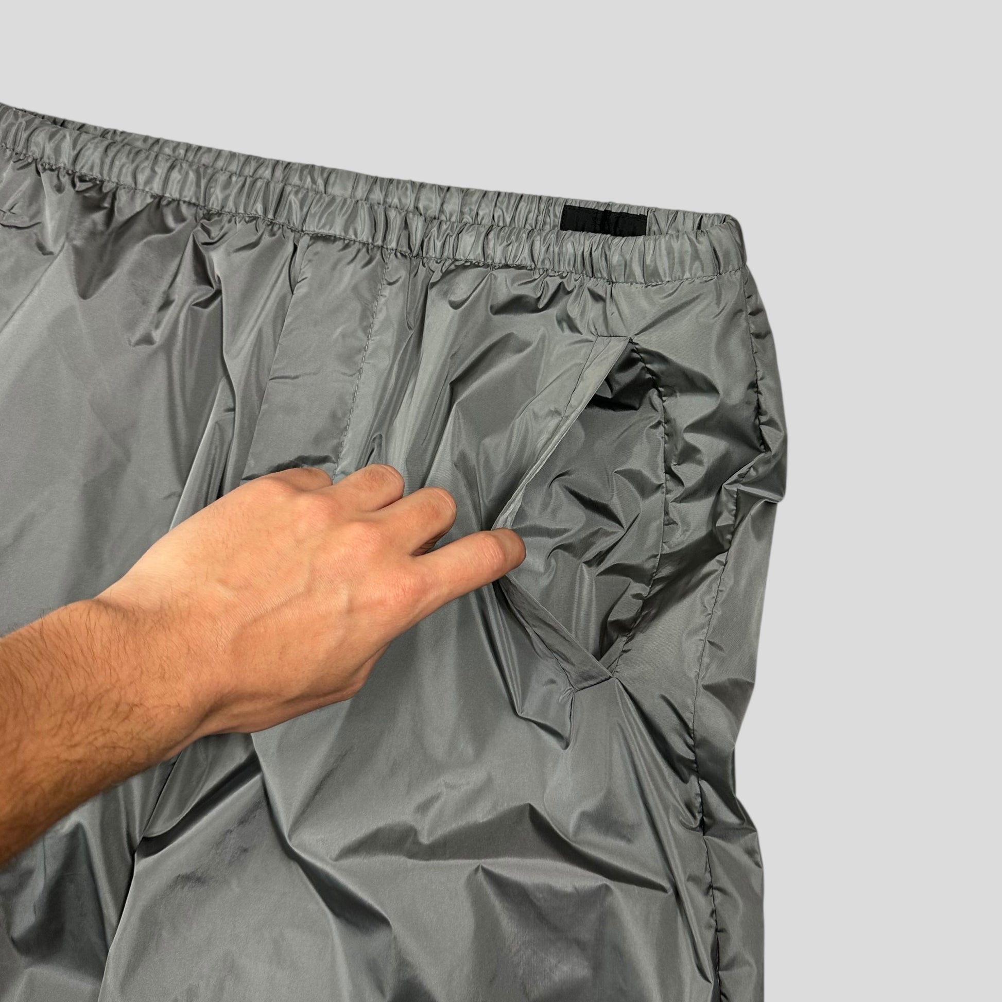Incredible 2024 New Season lightweight Ferro silver / grey nylon baggy loose fit trousers, plaque logo to back pocket, material shimmers in the sun.