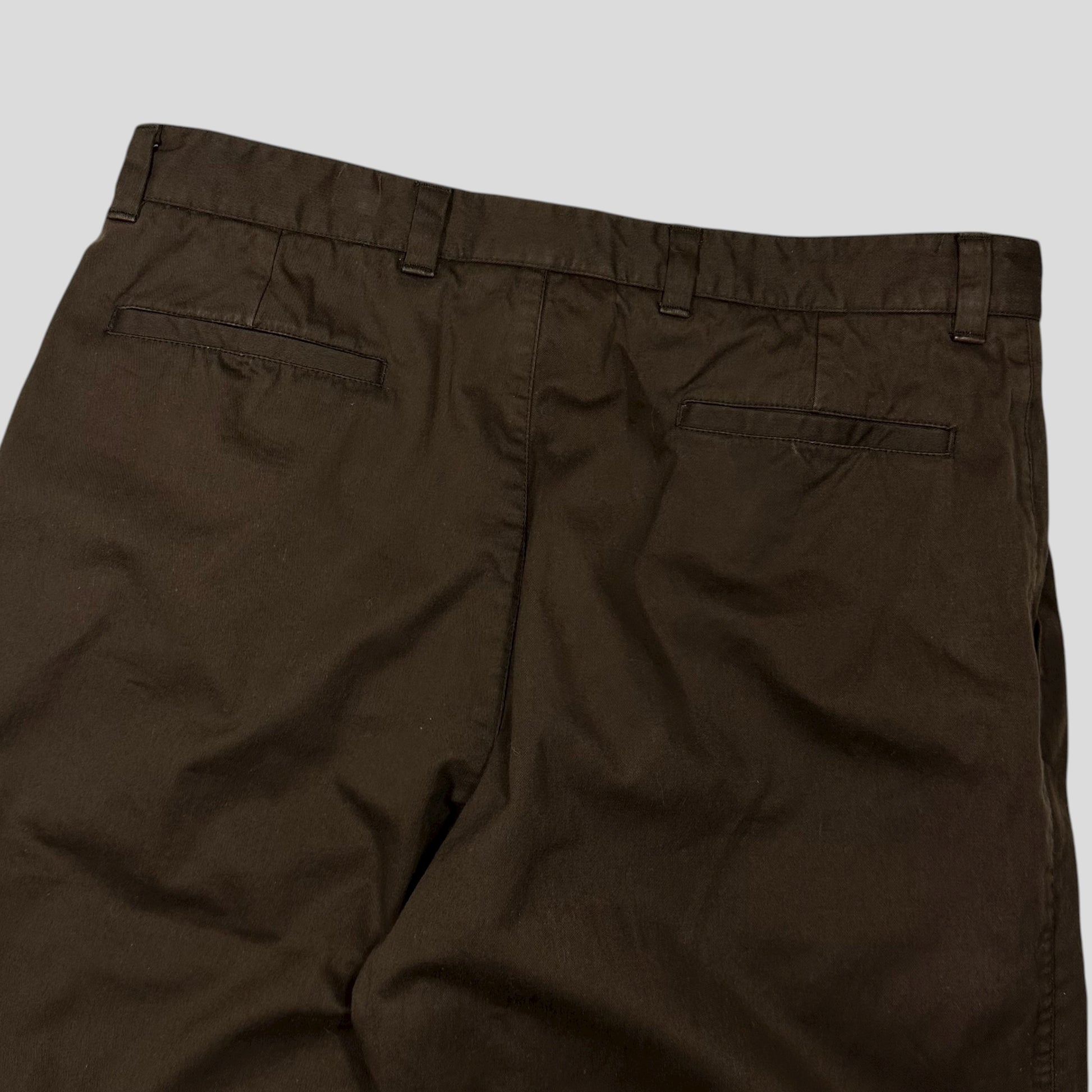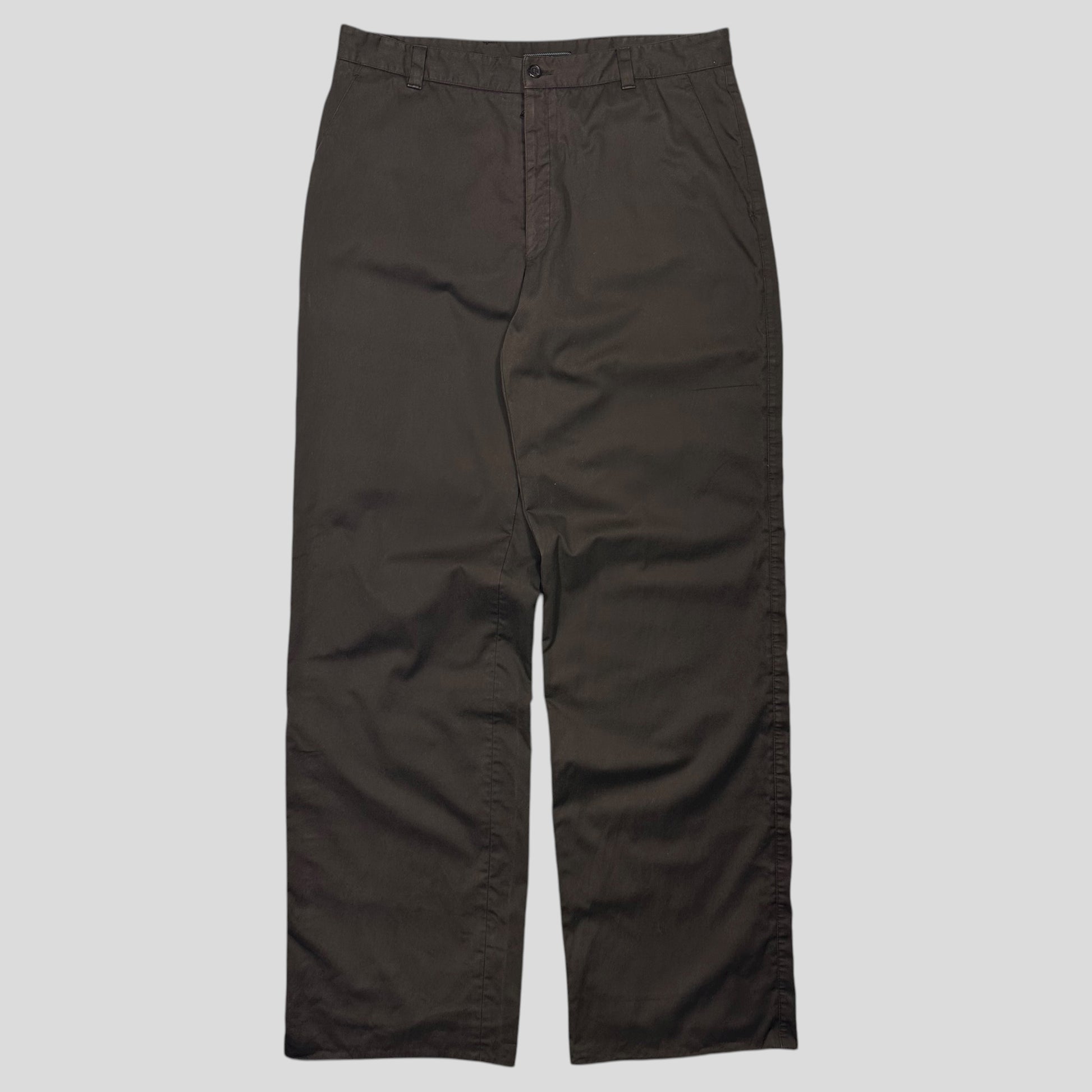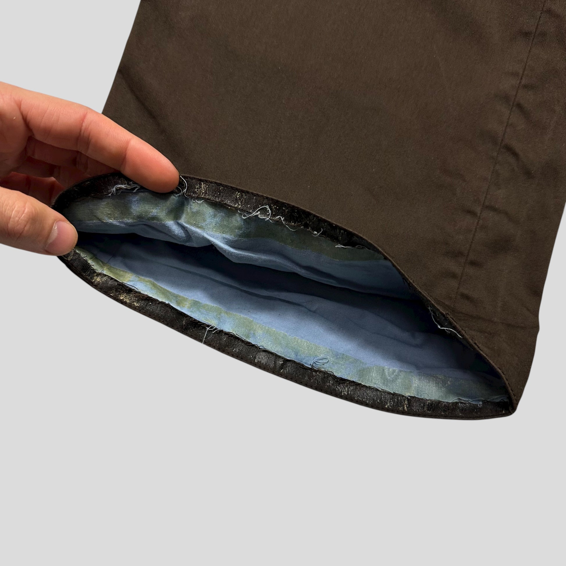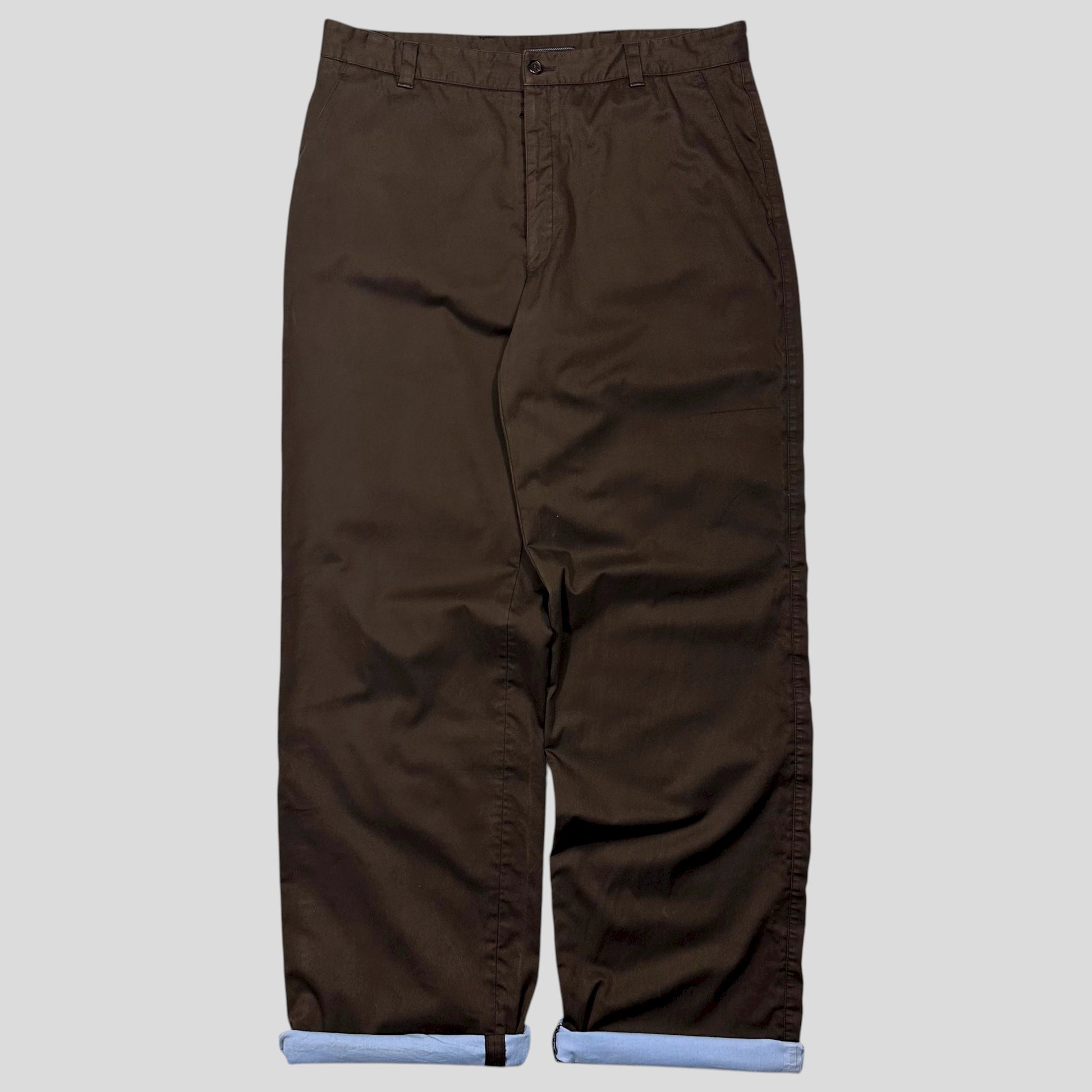 Extremely rare Prada mainline autumn winter 2000 brown heavy cotton work trousers with waxed waterproofing finish, unique baby blue lining which shows when you turn the cuffs up, nylon pockets, leather branded waist tab, hand pockets and back pockets, branded buttons.