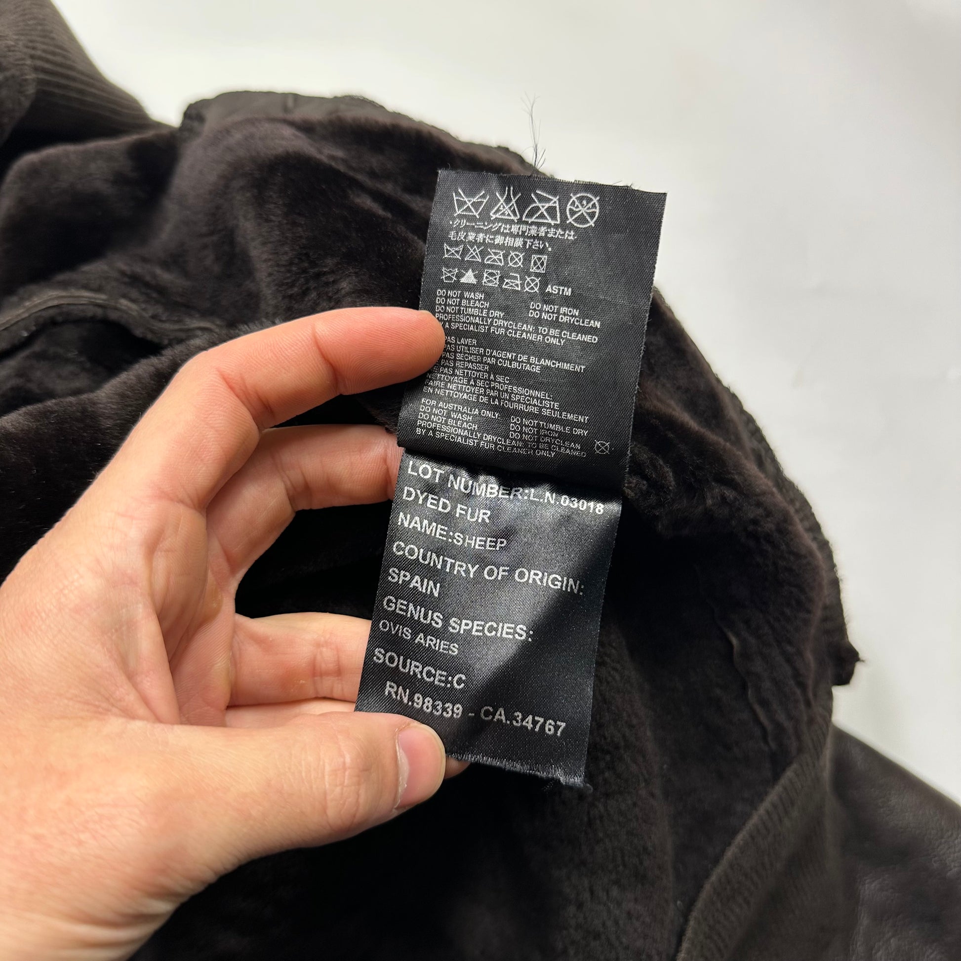 Incredible early 2000’s Prada mainline pure sheepskin leather boxy bomber jacket with extremely soft real black sheep fur lining throughout the entire coat, fur is very similar to mink and extremely soft and luxurious, leather outside is sheep, heavyweight wool collared premium leather with Prada leather zip and exposed chunky metal RIRI zippers, extra large hand pockets.