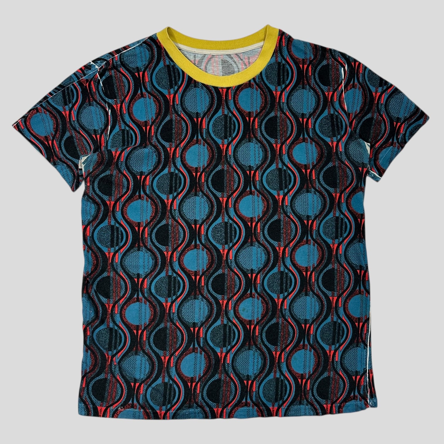 Rare 2014 Prada mainline ringer tee, geometric abstract print with yellow crewneck, Made in Italy.
