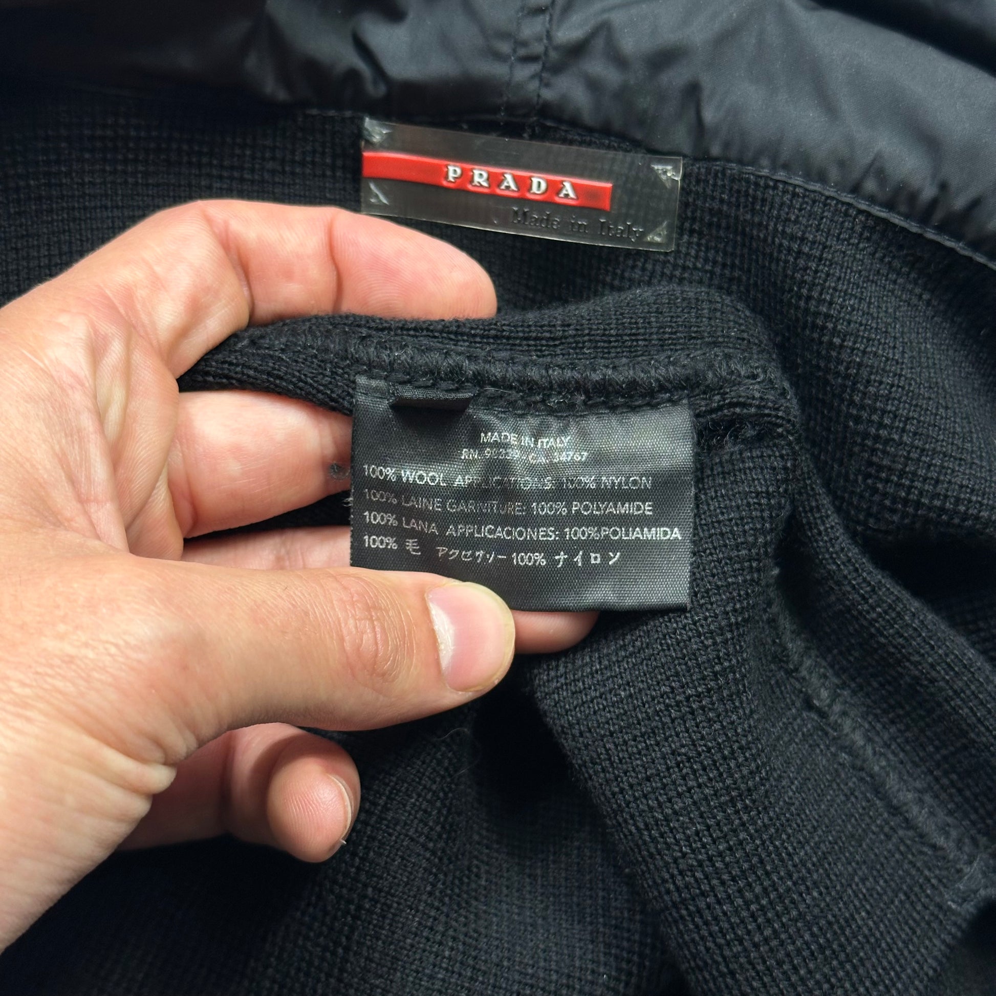 Very rare Prada Sport autumn winter 2000 heavy knitted wool cardigan jacket with nylon detailing to front and sides, with a crazy ninja peaked nylon detailed hood synonymous with this season.