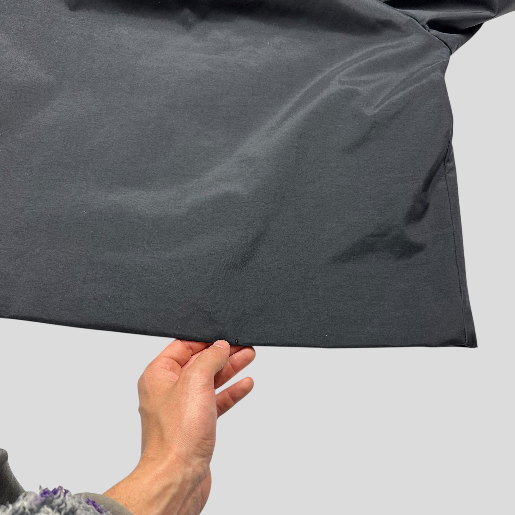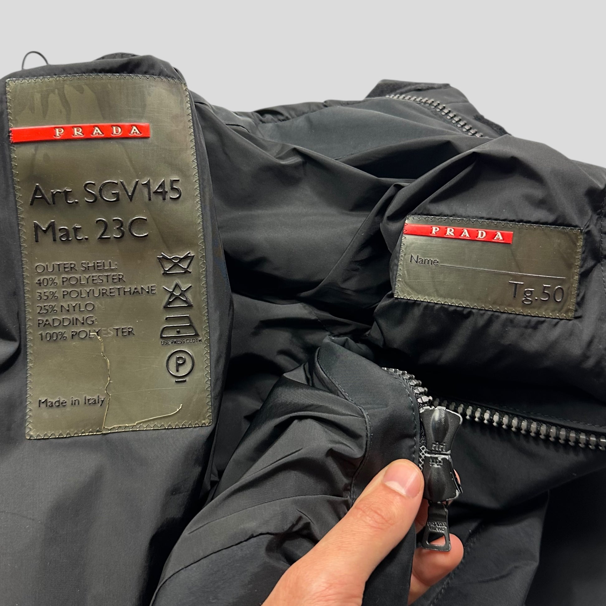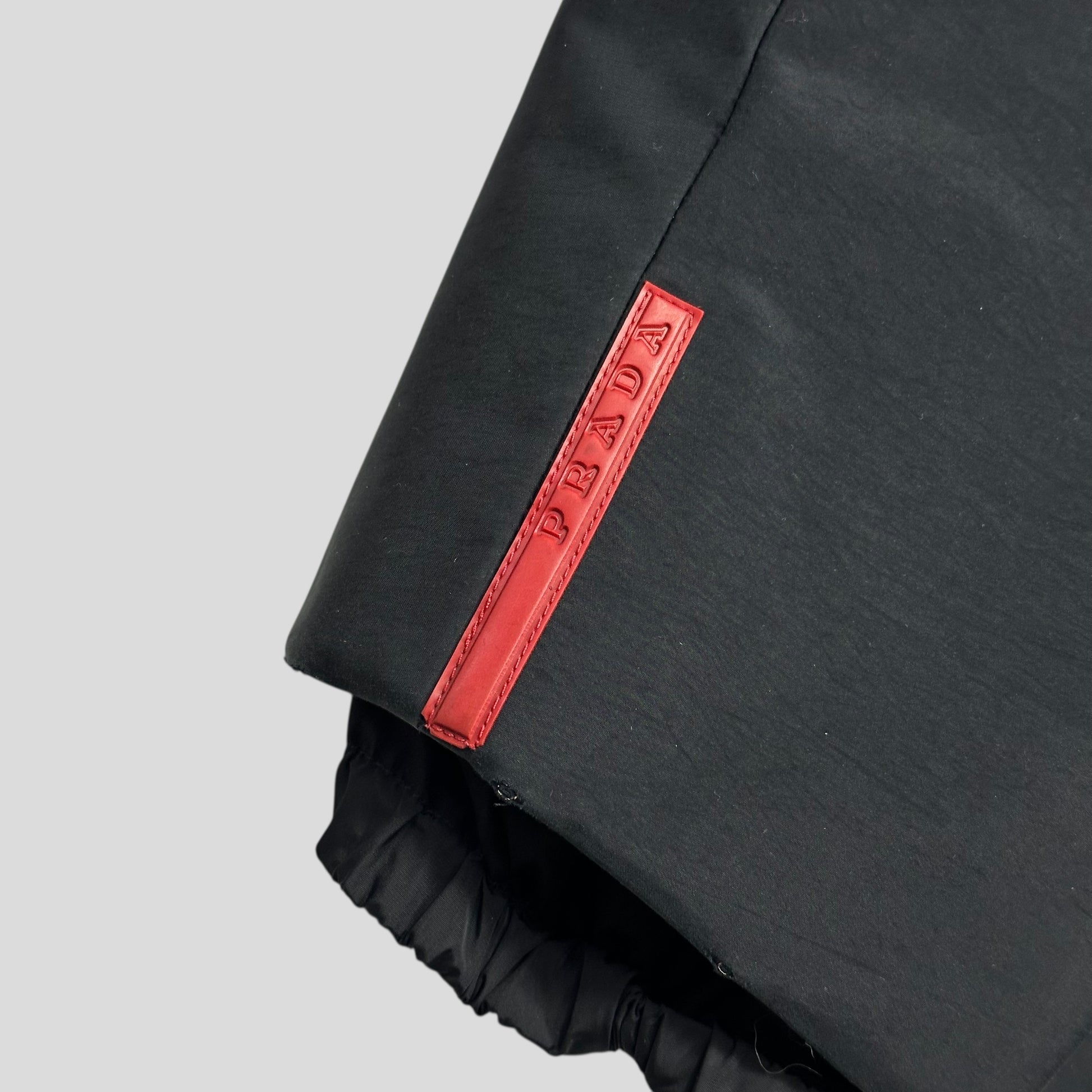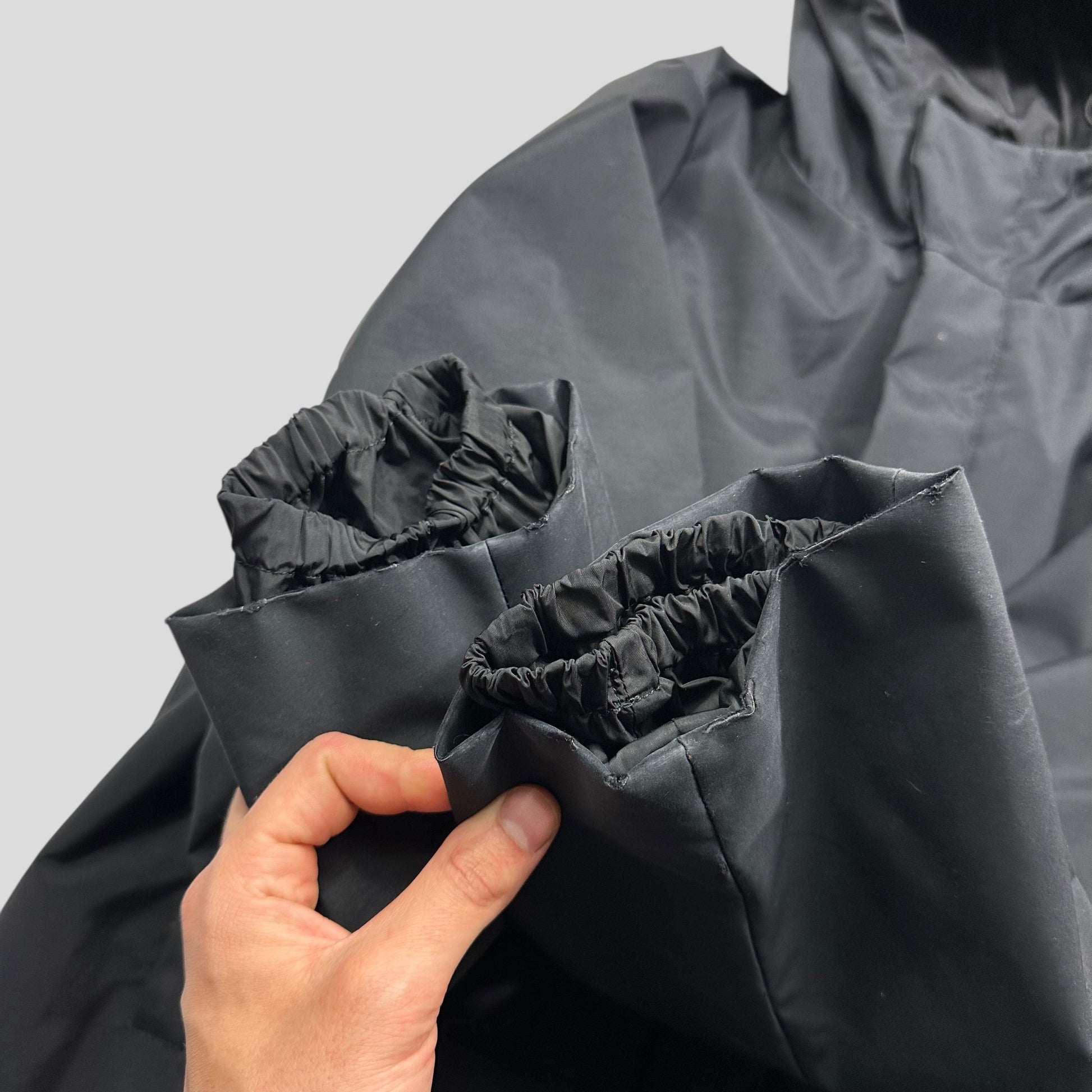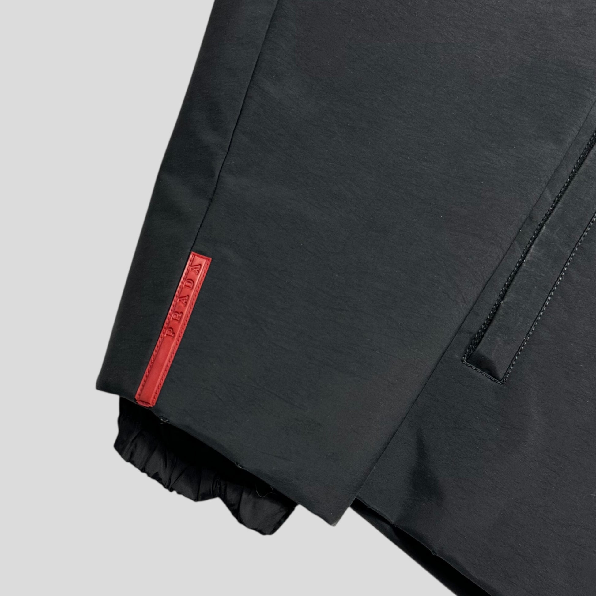 A unique piece from the Prada Sport AW99 collection, incredible iridescent black that changes colour in different lighting, carabiner toggle in pocket, unique dual layer hood, the jacket is constructed from a reinforced padded poly nylon mix that feels bombproof and shimmers in the sun, completely unique to this season and Prada.
