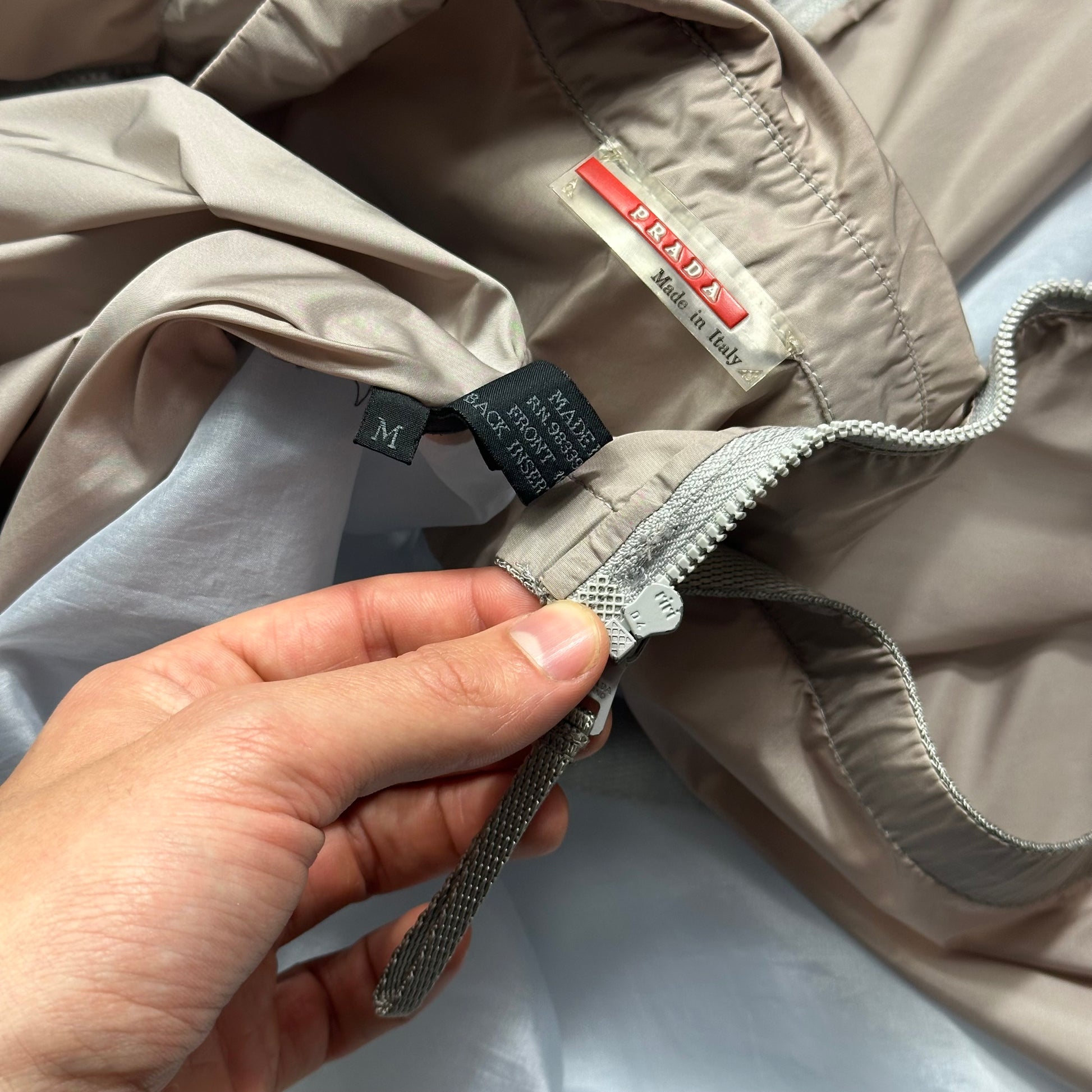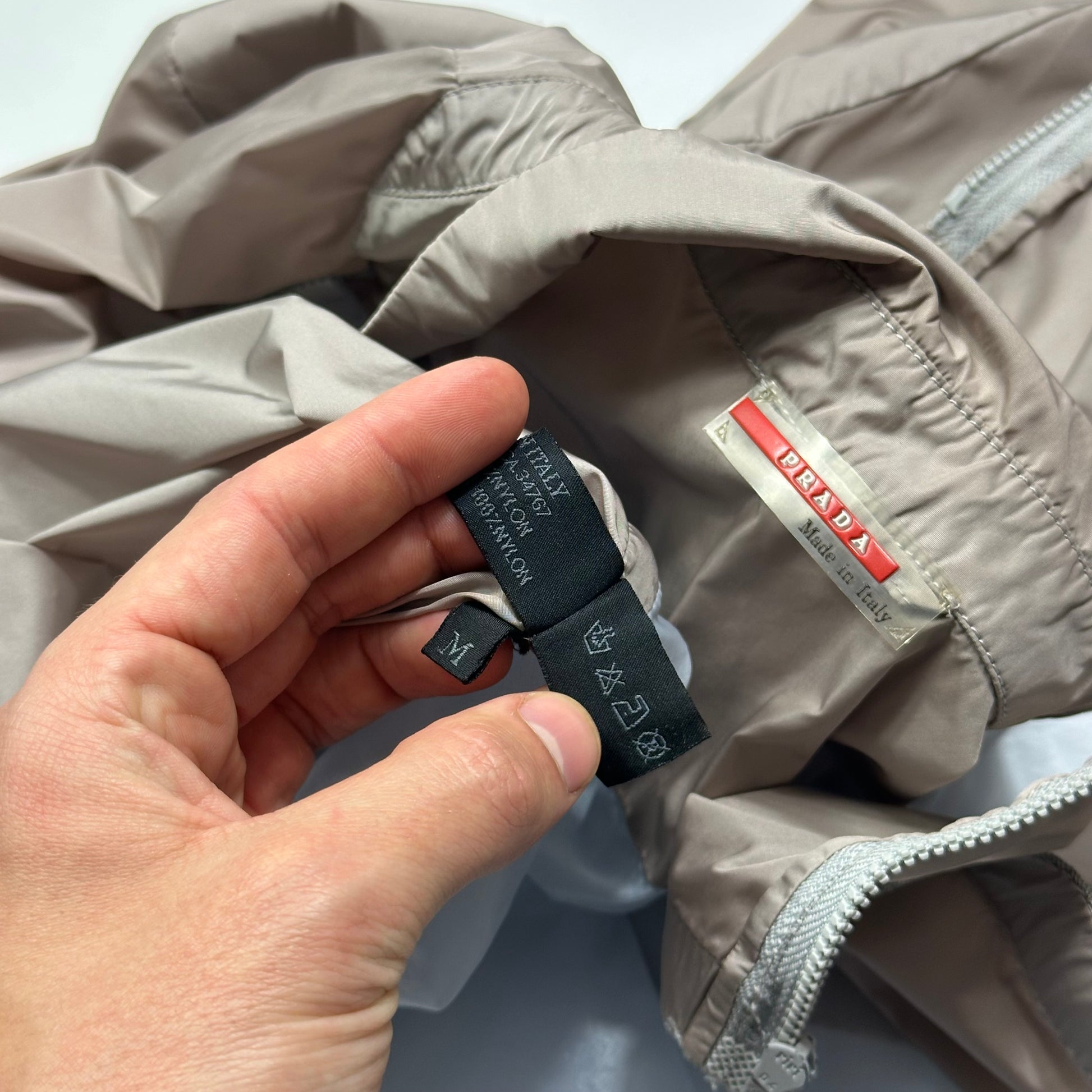 Extremely rare spring summer 2000 Prada Sport boxy zip-up nylon shirt with iconic baby blue gel seam stripes seen throughout this season, back panel is a transparent baby blue, front shirt is a nylon taupe.